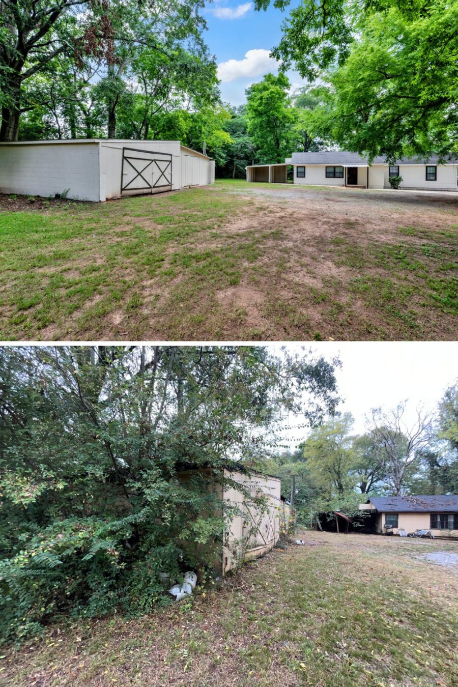 Backyard/Side View: Uncovered an awesome storage/workshop building. Contractor replaced and rebuilt the roof. The structure was in good condition. Repainted to match the house.
