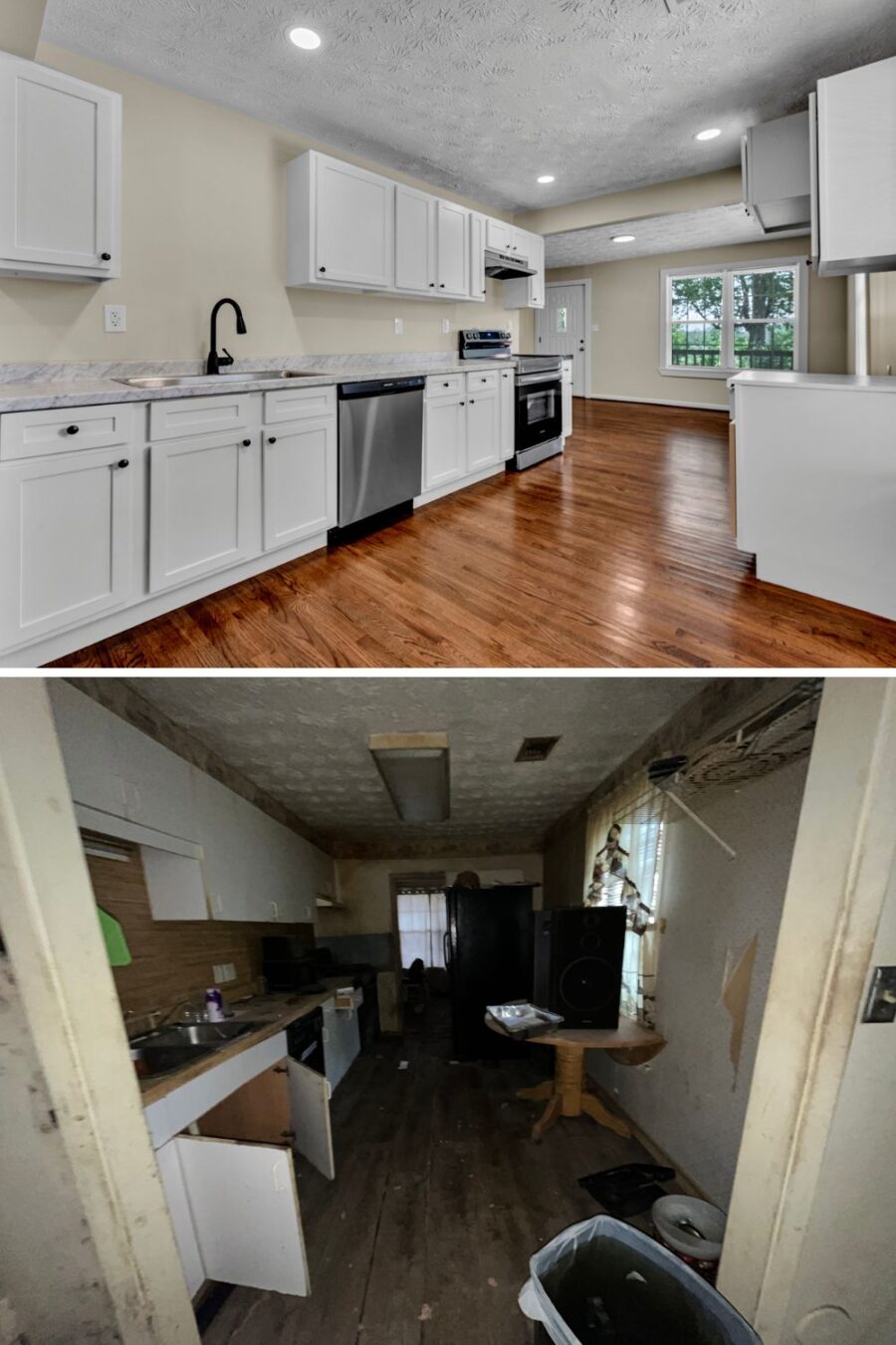 Kitchen: Removed all the old cabinets and flooring. Replaced with brand new cabinets, countertops and appliances. Opened up both entryways to the dining room and living room. Huge difference!